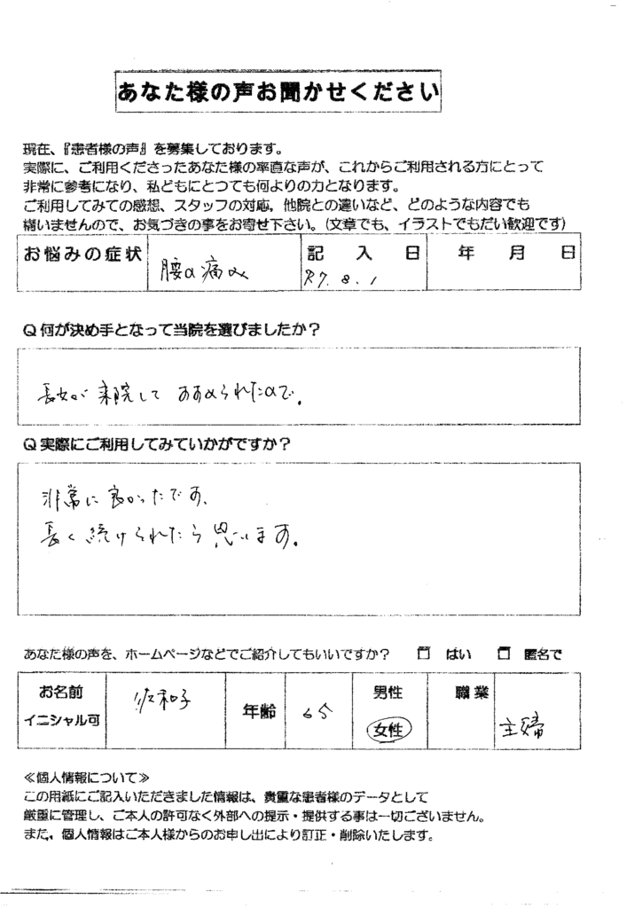 2025年8月7日 / 最終更新日時 : 2025年8月7日 bodybalance お客様の声 腰の痛みや背中の痛みに長い間悩んでいました。佐賀市整体 腰の痛み治したい 背中の張り整体 腰の痛みや背中の痛みに長年悩んでいました。 娘さんにすすめられて来院されました。 非常に良かったです。 長く続けられたらと思います。 開業から20年以上の治療実績! 施術メニューは 全身疲労・坐骨神経痛・ぎっくり腰・椎間板ヘルニア・骨盤矯正・慢性腰痛 プラクティック口コミ1000件以上 腰痛整体、肩こり整体、口コミ多数の整体院;;;;;;;;; Bluesky
