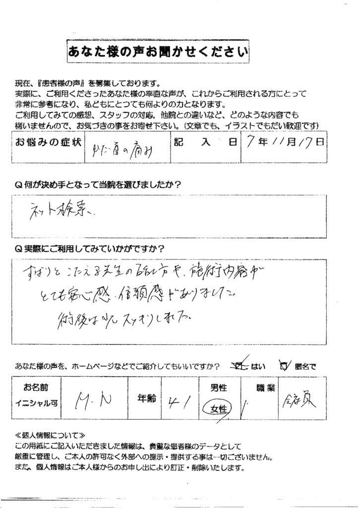 2025年12月1日 / 最終更新日時 : 2025年12月1日 bodybalance お客様の声 肩痛、首痛、身体の歪み 佐賀整体 カイロプラクティック身体のメンテナンス 肩、首の痛み 身体の歪みが気になり来院されました。 ずばりと答える先生の話し方や施術内容がとても安心感、信頼感がありました。 施術後は少しスッキリしました。 カイロプラクティック口コミ整体口コミ1000件以上 腰痛整体、肩こり整体、口コミ多数の整体院;;;;;;;;;開業から20年以上の治療実績! 施術メニューは 全身疲労・坐骨神経痛・ぎっくり腰・椎間板ヘルニア・骨盤矯正・慢性腰痛 ;