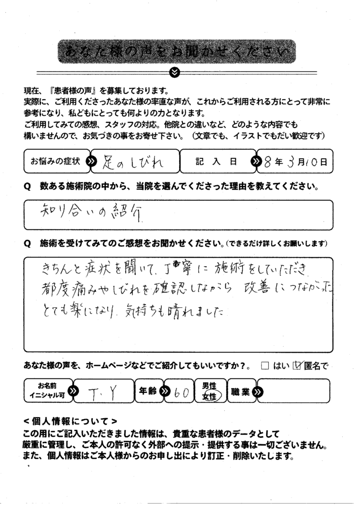 2026年3月11日 / 最終更新日時 : 2026年3月11日 bodybalance お客様の声 腰痛、坐骨神経痛、足の痺れ、佐賀整体、カイロプラクティック身体のメンテナンス 腰痛、坐骨神経痛、足の痺れで来院されました。 きちんと症状を聞いて、丁寧に施術をしていただき、都度痛みや しびれを確認しながら 改善にづながった。 とても楽になり、気持ちも晴れました。 カイロプラクティック口コミ整体口コミ1000件以上 腰痛整体、肩こり整体、口コミ多数の整体院;;;;;;;;;開業から20年以上の治療実績! 施術メニューは 全身疲労・坐骨神経痛・ぎっくり腰・椎間板ヘルニア・骨盤矯正・慢性腰痛 ; Bluesky